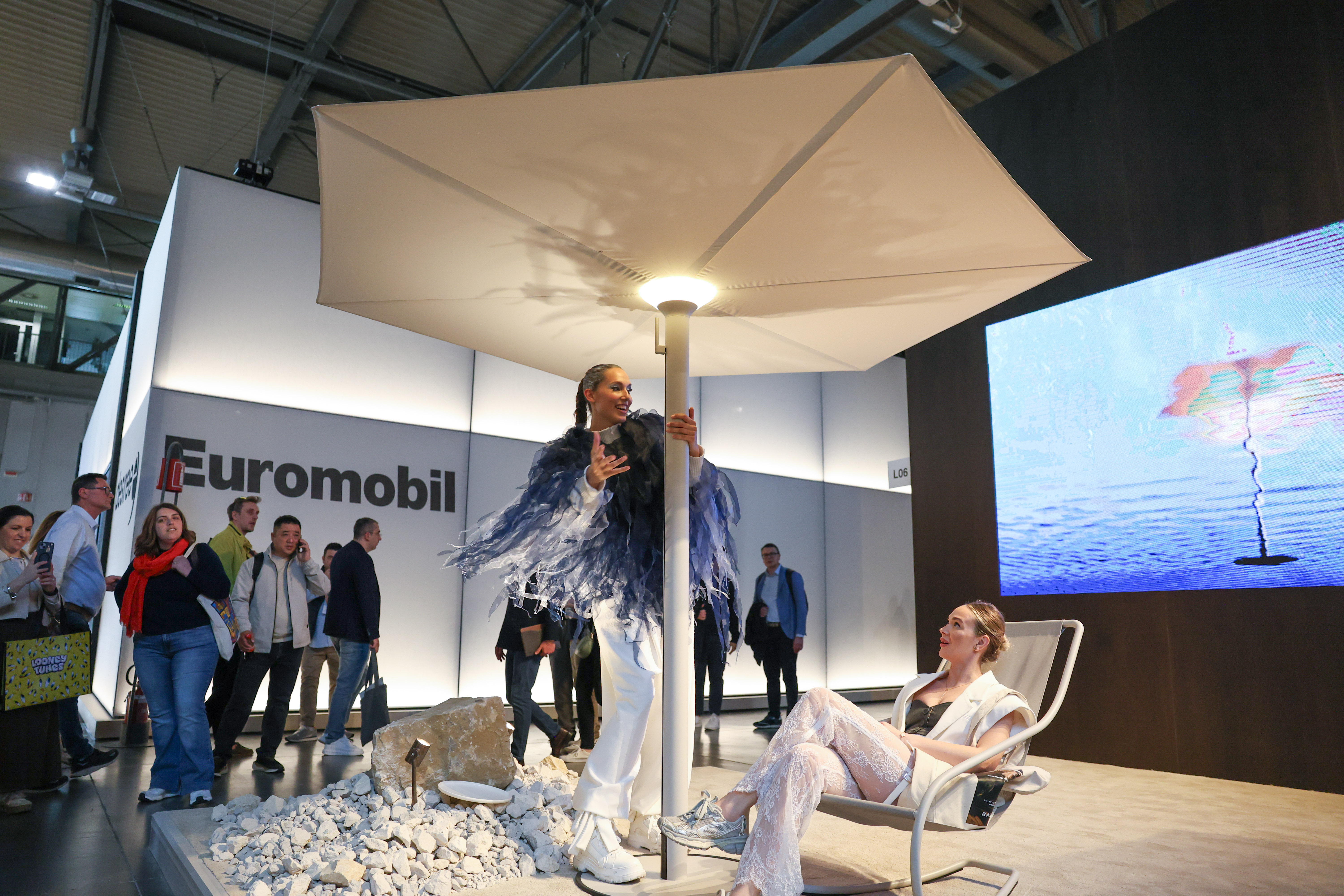 4月22日,在意大利米兰国际会展中心,人们在米兰家具展参观户外用品。